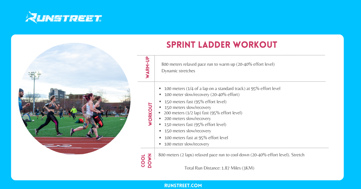 A ladder workout starts with shorter intervals, moves up to longer distances, and then returns to the shorter-distance intervals. You can do these ladder drills on a track or program it into your GPS watch for a road workout. If you have a Garmin watch, check out my article on How to Program Garmin Workouts for help.