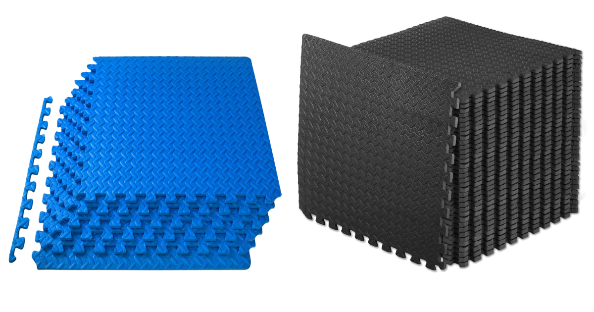 Puzzle Mats. These come in different color options and thicknesses. I recommend the thicker mats and use the 1”-thick puzzle mats the most for maximum cushioning.