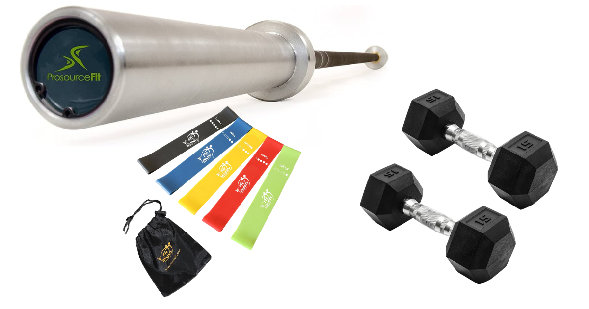 If you have a larger budget or are an advanced weightlifter, check out ProSourceFit’s Olympic barbell, which is a sturdy and durable barbell that we use. The women’s barbell is 33 lbs. and 79 inches long, and the men’s barbell is 44 lbs. and 86.6 inches long. Be sure to measure your space before getting this barbell as it will take up more space than your dumbbells and weight bench. The barbell is a great investment for those who want to build lean muscle and improve strength more quickly than by using dumbbells alone. The great thing about a barbell is you have almost unlimited weight amounts you can add so you have lots of room to grow in your fitness program.